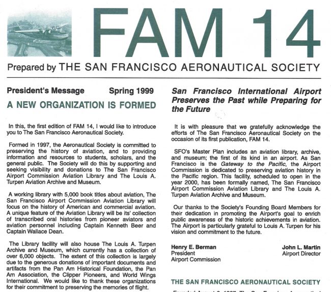 Spring 1999 – Welcome to the first edition of FAM14, the newsletter of The San Francisco Aeronautical Society. Learn all about our organization, as well as the San Francisco Airport…