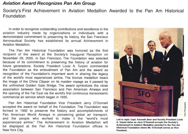Summer 2001 – The Pan Am Historical Foundation is chosen as the first recipient of the Achievement in Aviation Award for its outstanding contributions to the aviation industry. The Society…
