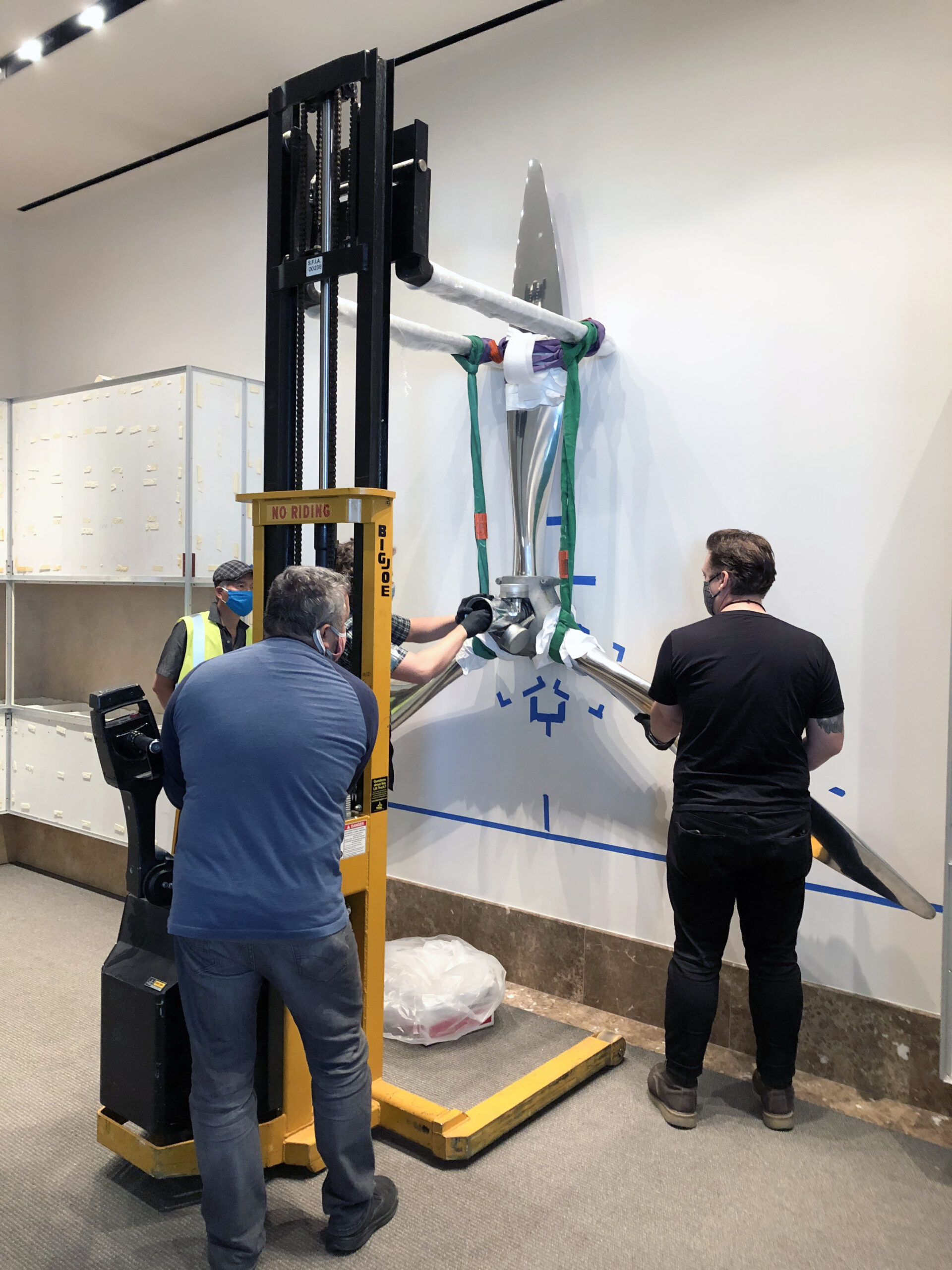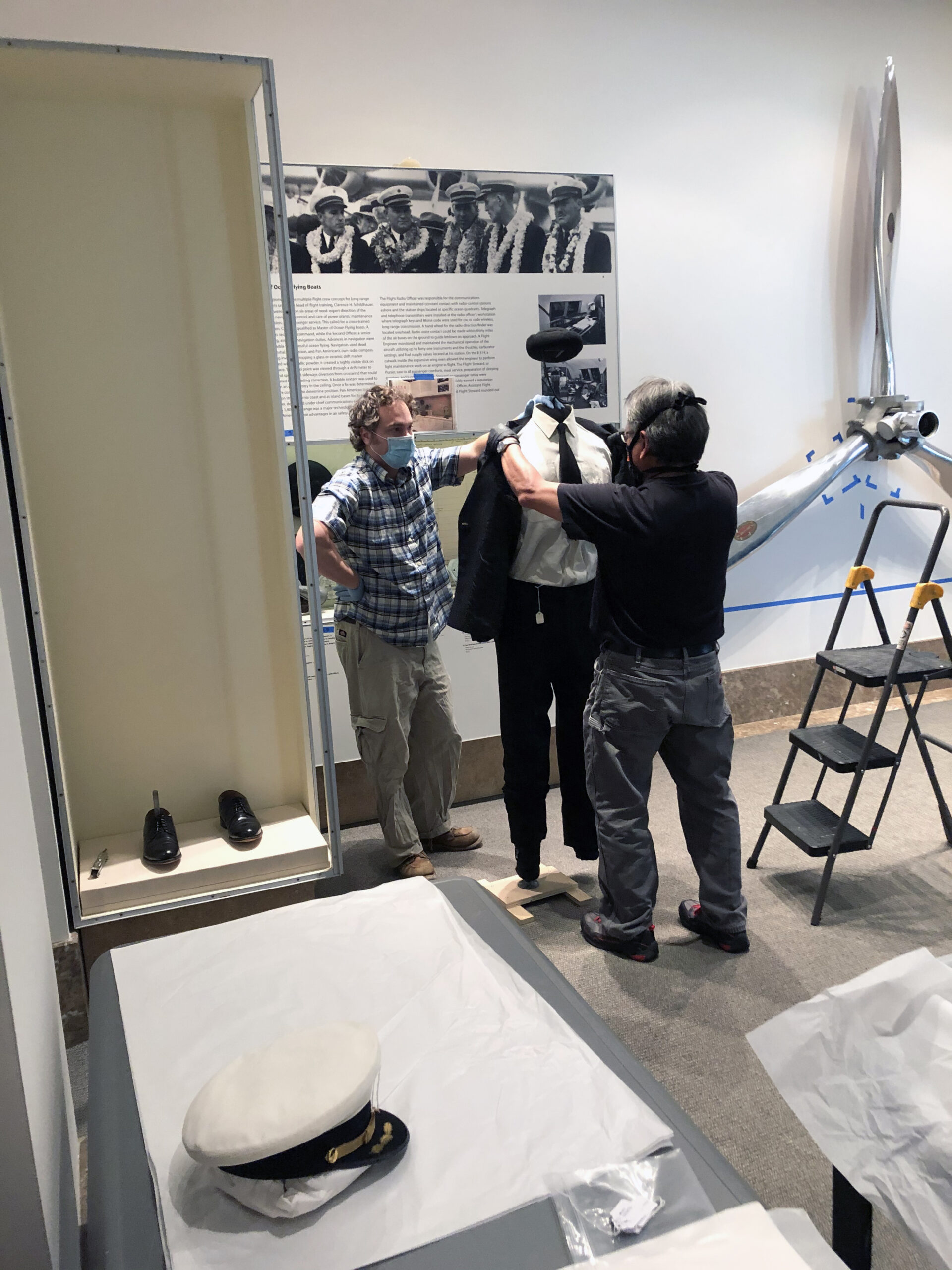 SFO Museum staff de-installing from left to right: a model of the Pan American Airways Martin M-130 “China Clipper”; the Hamilton Standard 3E 50-97 Constant Speed Propeller; and removing the Pan American Airways captain uniform components